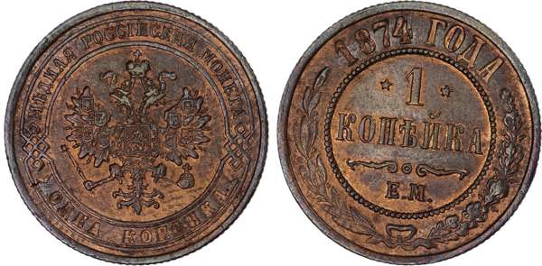 Russia, Empire. Alexander II CU Kopeck. Ekaterinburg mint, 1874. Crowned double-headed eagle facing with wings spread, wearing shield on breast depicting St. George slaying the dragon, with shields arranged across wings, and holding sceptre and orb; crown with ribbons above, МѢДНАЯ РОССІИСКАЯ МОНЕТА and denomination in ornamented banner around / Denomination above E.M., surrounded by inner circle of pellets; date above and wreath around. Bitkin 429. 3.33g, 21mm, 12h.