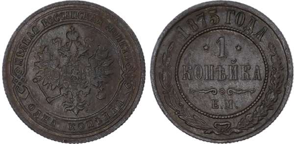 Russia, Empire. Alexander II CU Kopeck. Ekaterinburg mint, 1875. Crowned double-headed eagle facing with wings spread, wearing shield on breast depicting St. George slaying the dragon, with shields arranged across wings, and holding sceptre and orb; crown with ribbons above, МѢДНАЯ РОССІИСКАЯ МОНЕТА and denomination in ornamented banner around / Denomination above E.M., surrounded by inner circle of pellets; date above and wreath around. Bitkin 430. 3.30g, 22mm, 12h.