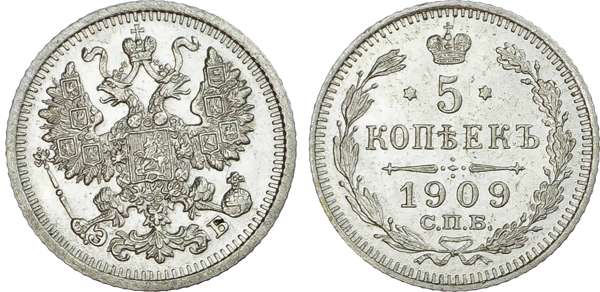 Russia, Empire. Nicholas II AR 5 Kopeck. St. Petersburg mint, 1909. ‡