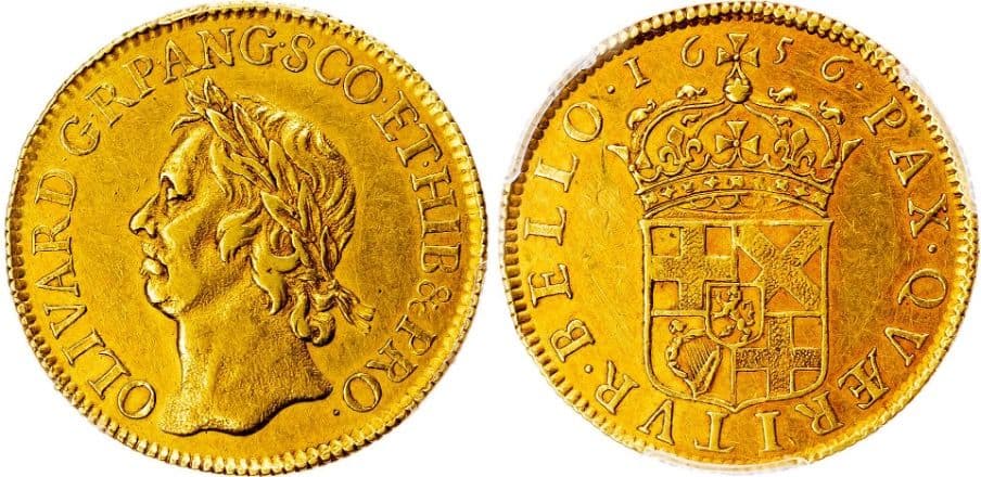 In Baldwin’s auction of coins and medals on the 30th March, there is a spectacular gold broad of Oliver Cromwell, dated 1656, (lot 113).